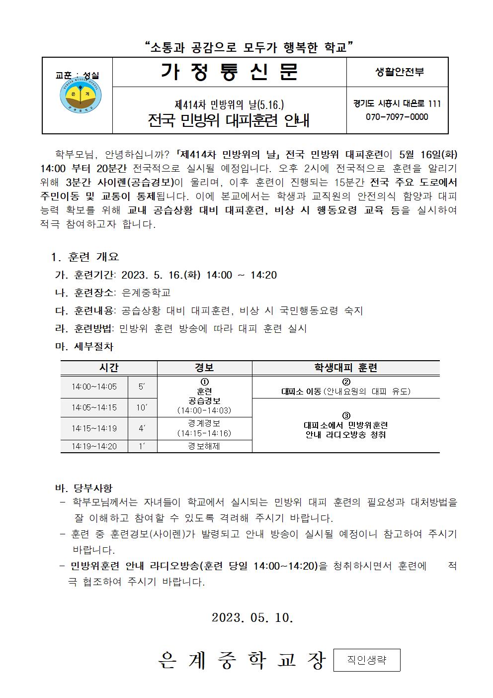 [ÀϹÝ] [Àº°èÁß 2023-79È£]Á¦414Â÷ ¹Î¹æÀ§ÀÇ ³¯(5.16.)  Àü±¹ ¹Î¹æÀ§ ´ëÇÇÈÆ·Ã ¾È³»ÀÇ Ã·ºÎÀ̹ÌÁö 1