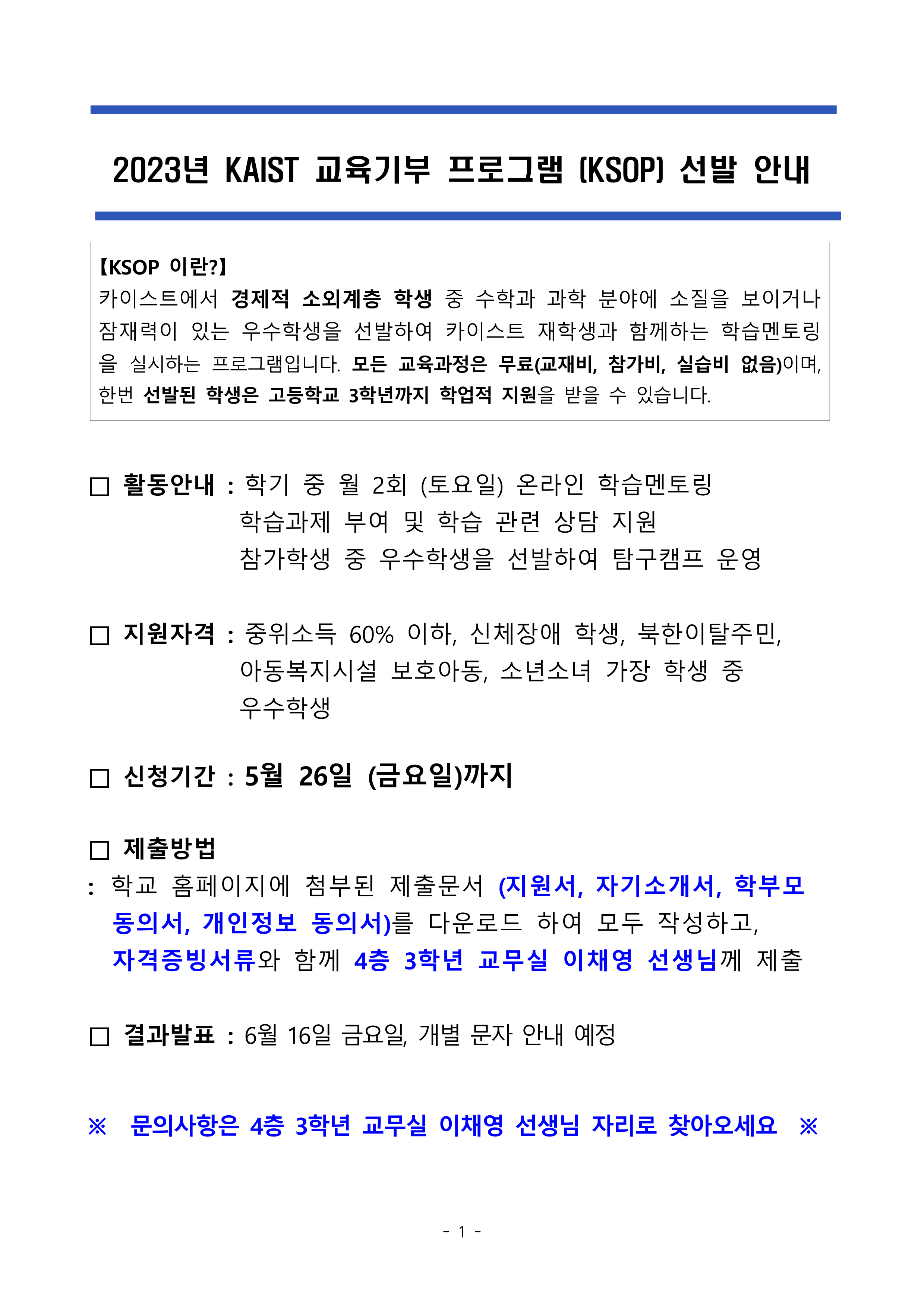 [ÀϹÝ] 2023³â KAIST ±³À°±âºÎ ÇÁ·Î±×·¥(KSOP)¼±¹ß ¾È³»ÀÇ Ã·ºÎÀ̹ÌÁö 1
