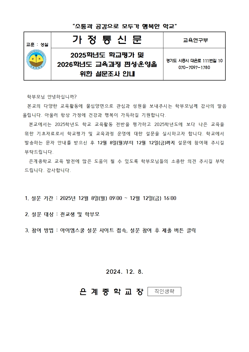 [ÀϹÝ] [Àº°èÁß 2025-158È£] 2025 Çб³Æò°¡ ¹× ±³À°°úÁ¤ Æí¼º¡¤¿î¿µÀ» À§ÇÑ ¼³¹®Á¶»ç ¾È³» °¡Á¤Åë½Å¹®ÀÇ Ã·ºÎÀ̹ÌÁö 1