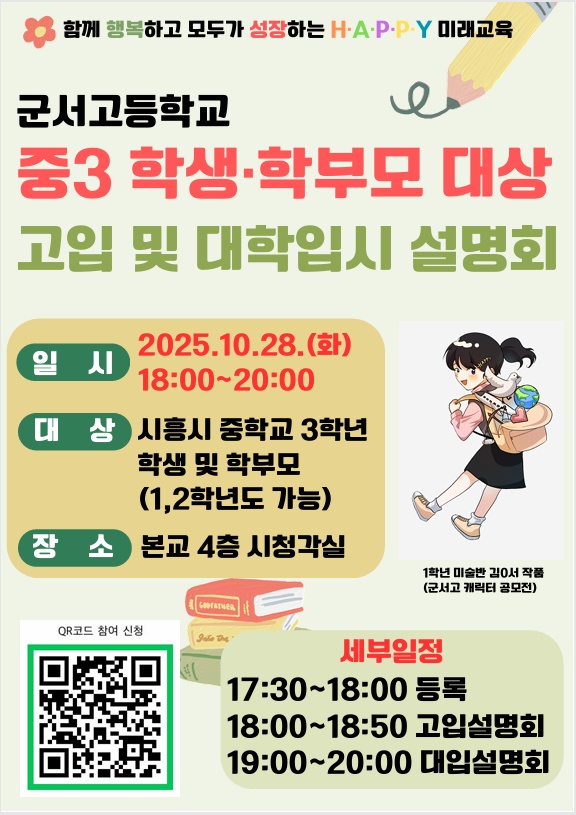 2026Çг⵵ ¾È¾ç¿Ü±¹¾î°íµîÇб³ ÀÔÇÐ ¼³¸íȸ ¾È³» 1) ÀÏ ½Ã : 2025³â 11¿ù 1ÀÏ(Åä) 10½Ã 2) Àå ¼Ò : ¾È¾ç¿Ü±¹¾î°íµîÇб³ 3) Âü¿©´ë»ó : Áß3Çлý ¹× Çкθð 4) Âü¿©½Åû : ¾È¾ç¿Ü±¹¾î°íµîÇб³ ȨÆäÀÌÁö °øÁö»çÇ× ¹× ÆË¾÷(QR·Î ½Åû)