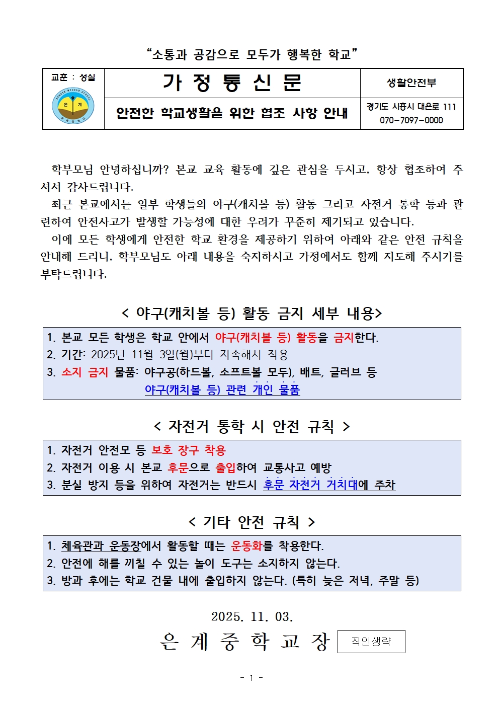 [ÀϹÝ] [Àº°èÁß 2025-143È£] ¾ÈÀüÇÑ Çб³»ýȰÀ» À§ÇÑ ÇùÁ¶ »çÇ× ¾È³»ÀÇ Ã·ºÎÀ̹ÌÁö 1
