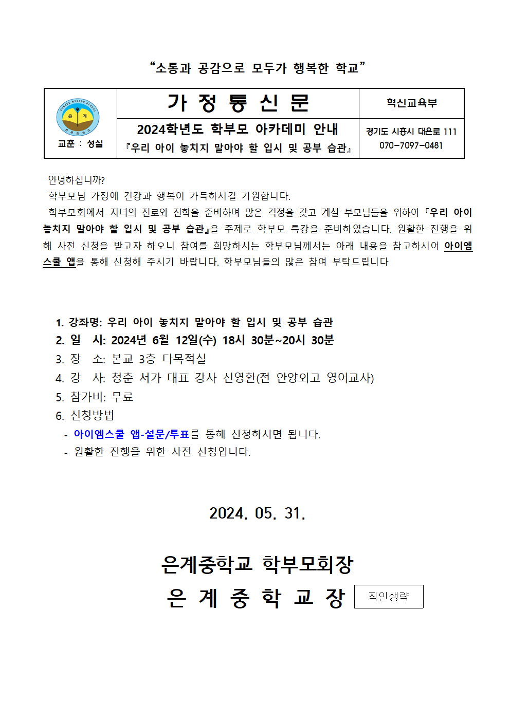 [ÀϹÝ] [Àº°èÁß 2024-112È£]2024Çг⵵ Çкθð¾ÆÄ«µ¥¹Ì °¡Á¤Åë½Å¹®(¿ì¸® ¾ÆÀÌ ³õÄ¡Áö ¸»¾Æ¾ß ÇÒ ÀԽà ¹× °øºÎ ½À°ü)