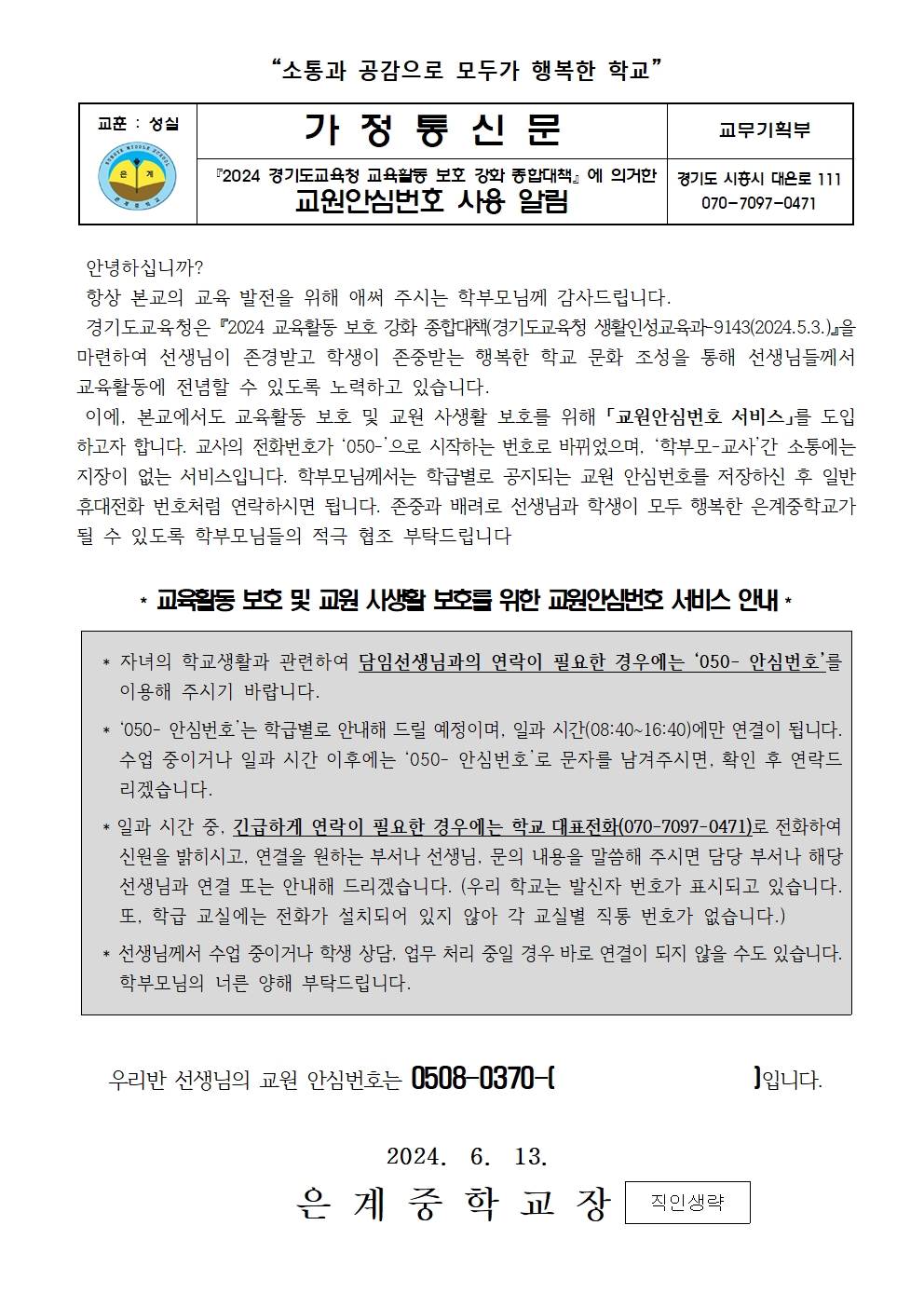 [ÀϹÝ] [Àº°èÁß 2024-119È£]¡º2024 °æ±âµµ±³À°Ã» ±³À°È°µ¿ º¸È£ °­È­ Á¾ÇÕ´ëÃ¥¡»¿¡ ÀǰÅÇÑ  ±³¿ø¾È½É¹øÈ£ »ç¿ë ¾Ë¸²ÀÇ Ã·ºÎÀ̹ÌÁö 1