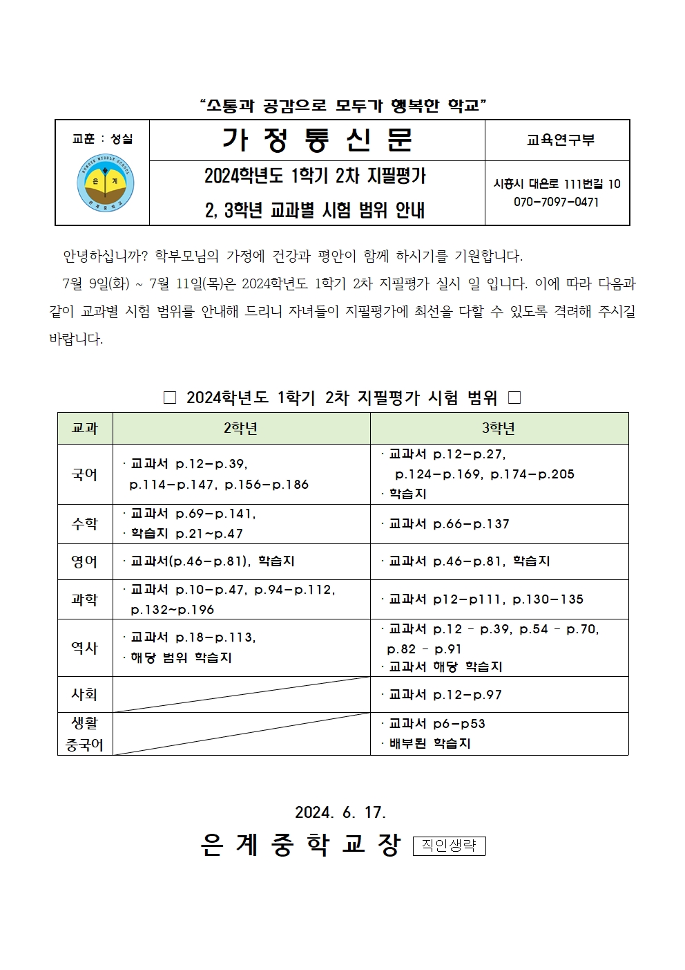 [ÀϹÝ] [Àº°èÁß 2024-123È£] 2024Çг⵵ 1Çбâ 2Â÷ ÁöÇÊÆò°¡ 2,3Çг⠱³°úº° ½ÃÇè¹üÀ§ ¾È³»ÀÇ Ã·ºÎÀ̹ÌÁö 1