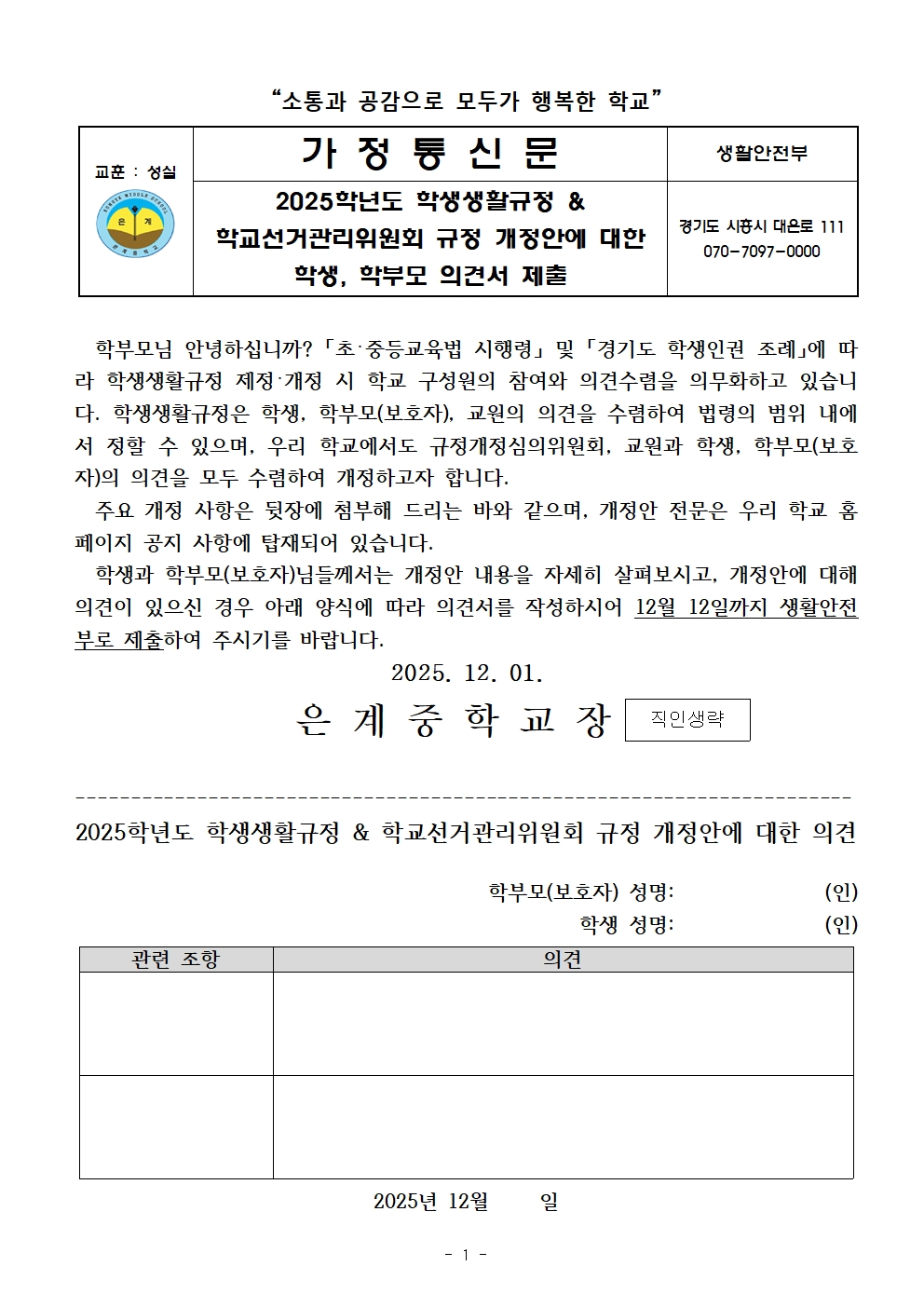 [ÀϹÝ] [Àº°èÁß 2025-155È£] 2025Çг⵵ Çлý»ýȰ±ÔÁ¤ , Çб³¼±°Å°ü¸®À§¿øÈ¸ ±ÔÁ¤ °³Á¤¾È¿¡ ´ëÇÑ Çлý, Çкθð Àǰ߼­ Á¦ÃâÀÇ Ã·ºÎÀ̹ÌÁö 1